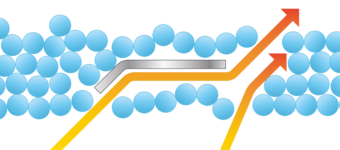従来の丸棒型スクリューでは風の通り道が確保できず、密着しやすい素材だと乾燥ムラが起きることがありました。攪拌スクリュー付きドライヤーは独自の羽型スクリューにより、流体力学に基づいた効率的な攪拌を実現します。